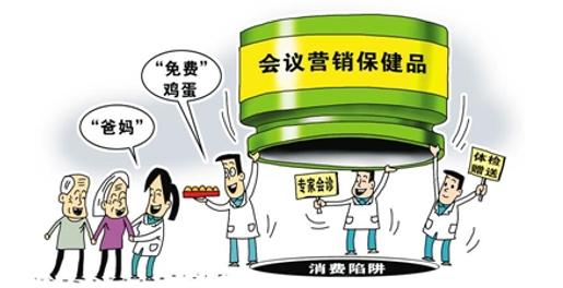 一些不法商家打着“养生”讲座的旗号忽悠老年人,以赠送鸡蛋、面条等小物品相诱惑,达到推销商品的目的。