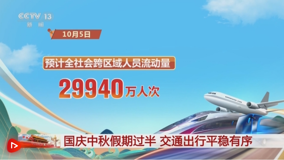 央视网消息:记者从交通运输部了解到,10月5日预计全社会跨区域人员流动量超2.99亿人次,同比增长6.3%。从9月29日到10月4日,铁路累计发送旅客超过1亿人次,运输安全平稳有序。10月5日铁路客流继续保持高位运行,中短途客流持续增多。铁路客运量预计1755万人次。