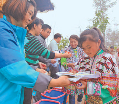 志愿者在为村民和孩子们发放图书、文具等。